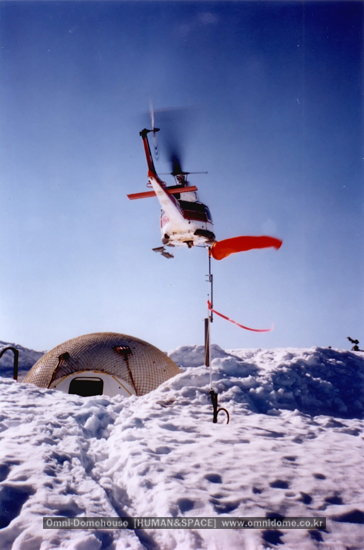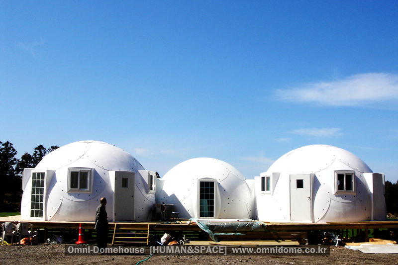 Omnidome House that is made with F.R.P material, which can simultaneously solve the problem of tentative housing and permanent housing, and it is an epoch-making house that can be built and disbanded within 3 to 4 hours.